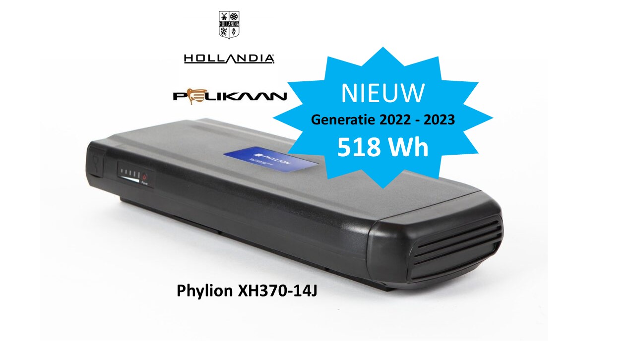 Phylion XH370 model 2024 for Hollandia & Pelican. EBG370-140H1S24, 518 Wh (37V, 14 Ah). Replaces the XH370-13J (-14J), -12J & -10J excl. LED. Now incl. FREE CHARGER! AVAILABLE FROM NOVEMBER 24